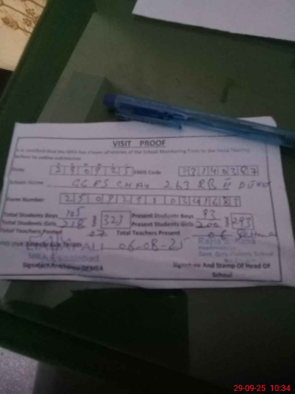 | Attendance Register | Head Teacher | MEA with School | Visit Proof |
