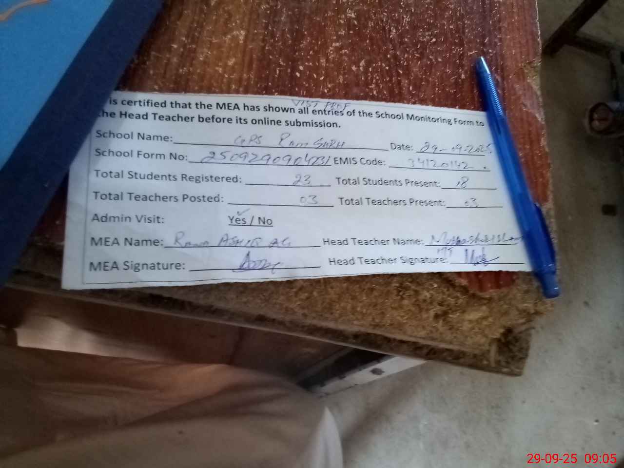 | Attendance Register | Head Teacher | MEA with School | Visit Proof |