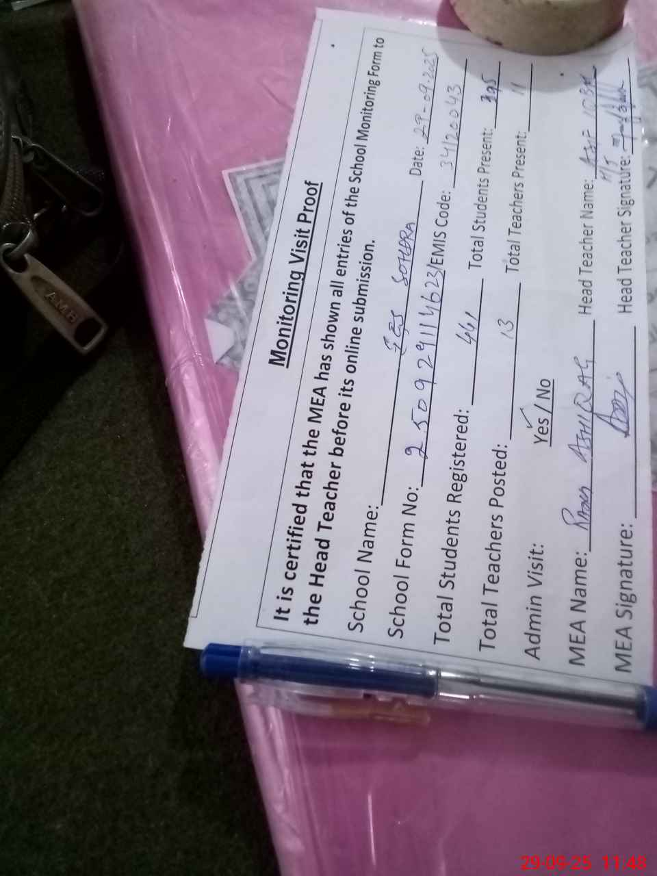 | Attendance Register | Head Teacher | MEA with School | Visit Proof |