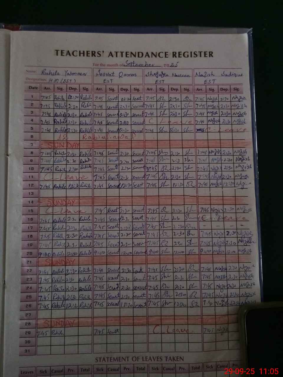 Leave Type | Remarks for today (Leave,Training, Exam,Absent,Late, Other duty) |
