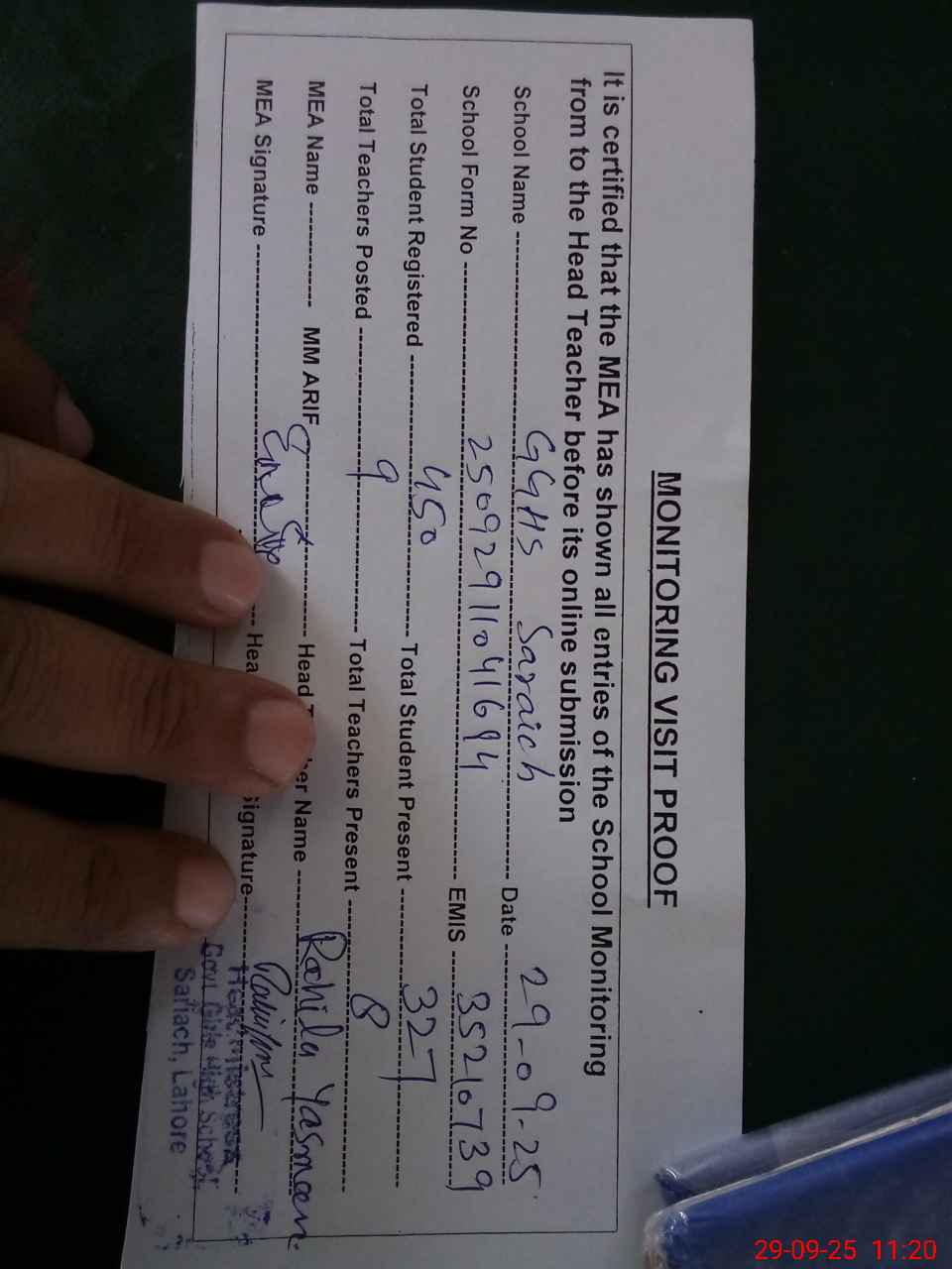 | Attendance Register | Head Teacher | MEA with School | Visit Proof |