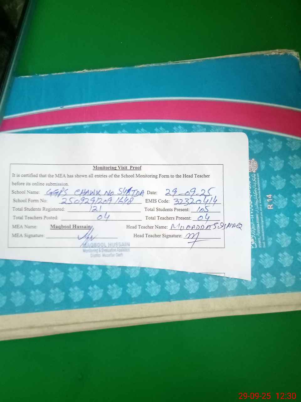 | Attendance Register | Head Teacher | MEA with School | Visit Proof |