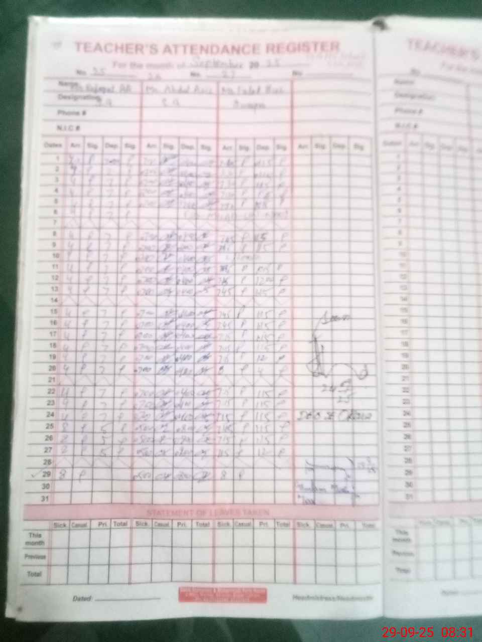 | Total no. of Classrooms: 29 No. of Classrooms Used for Teaching: 16 No. of Classrooms Storing Old Furniture, FTBs, etc: 0Comments if Any: Nominal roll for online attendance found contrary to current available students records Principal told that all enrolled students provided with free text books accordingly |