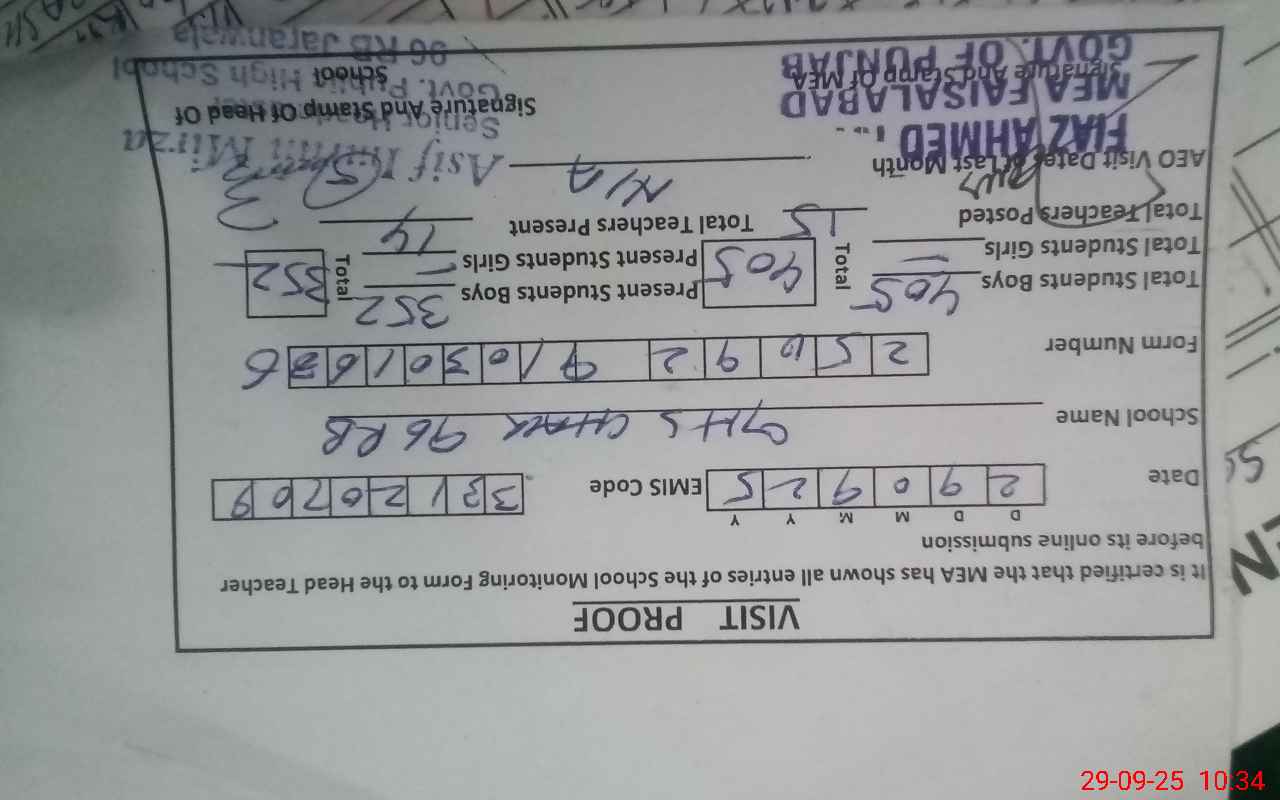 | Certified that this School was Inspected by the Undersigned MEA/DMO Today and the Information Stated Above is as Per Record. | |||||