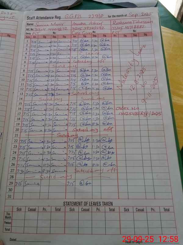 | CNIC | Full Name | Designation | R/C | Absence During Last Calender Month |