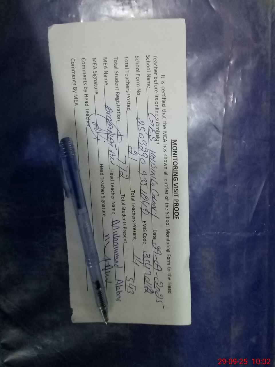 | Attendance Register | Head Teacher | MEA with School | Visit Proof |