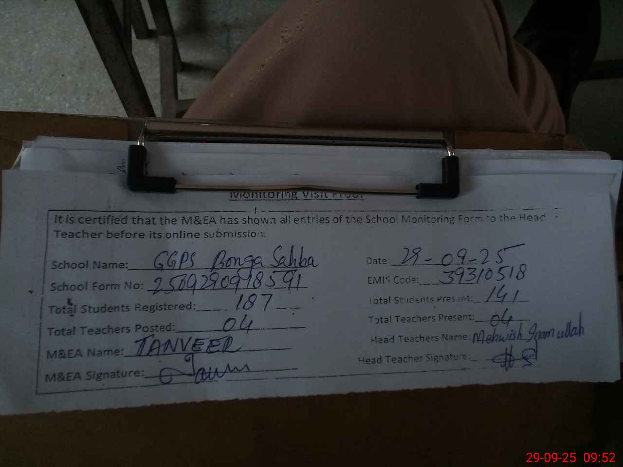 | Attendance Register | Head Teacher | MEA with School | Visit Proof |