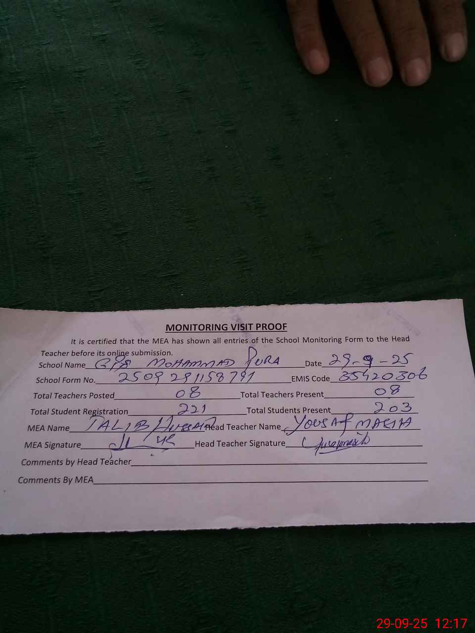 | Attendance Register | Head Teacher | MEA with School | Visit Proof |