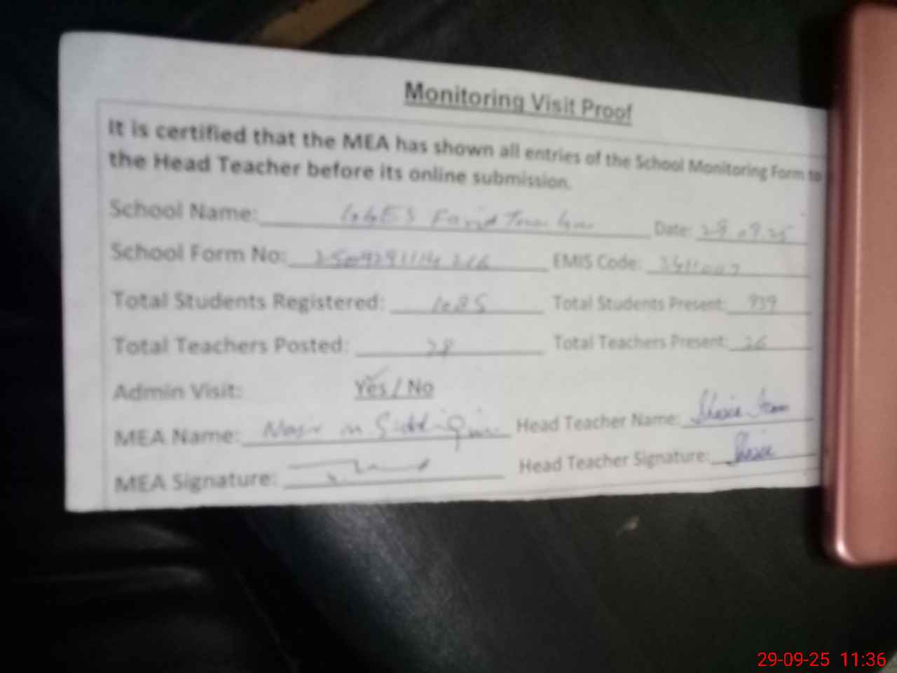 | Attendance Register | Head Teacher | MEA with School | Visit Proof |