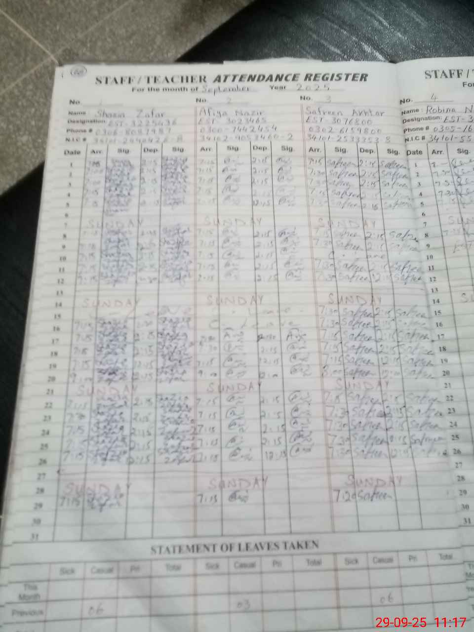 | CNIC | Full Name | Designation | R/C | Absence during last cal. month |