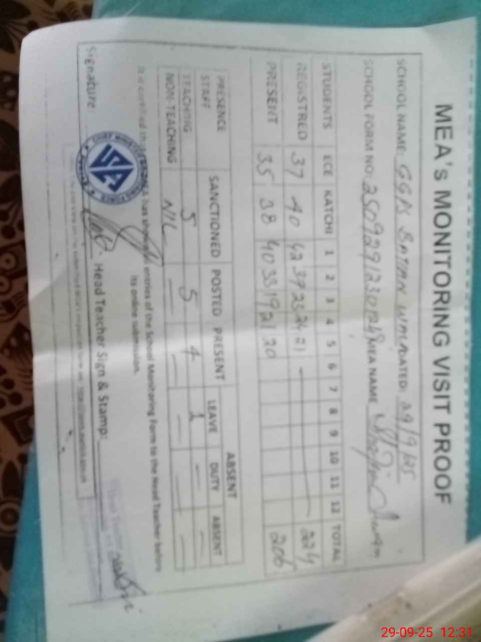 | Attendance Register | Head Teacher | MEA with School | Visit Proof |