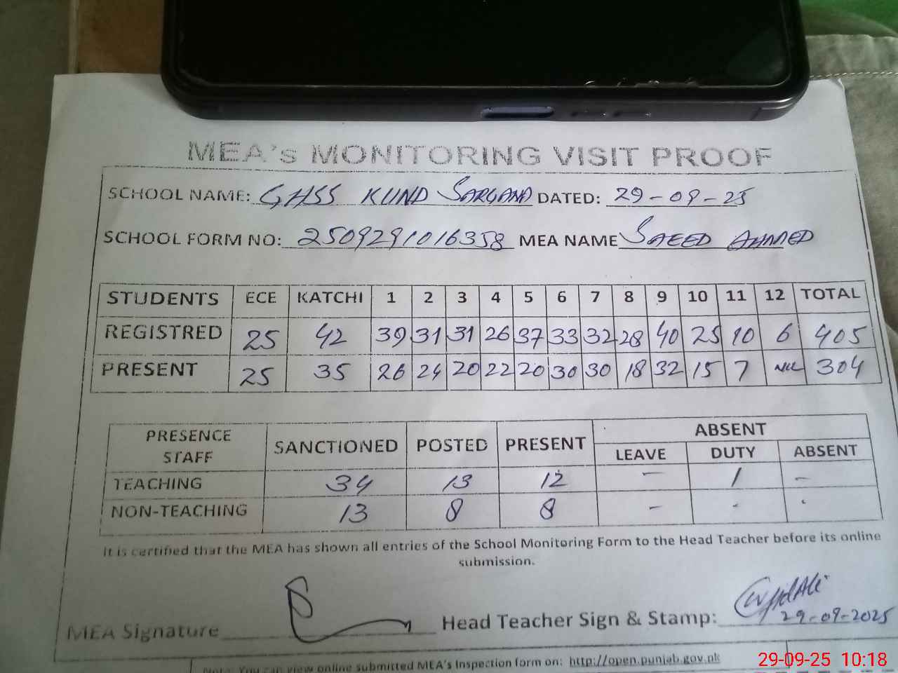| Attendance Register | Head Teacher | MEA with School | Visit Proof |