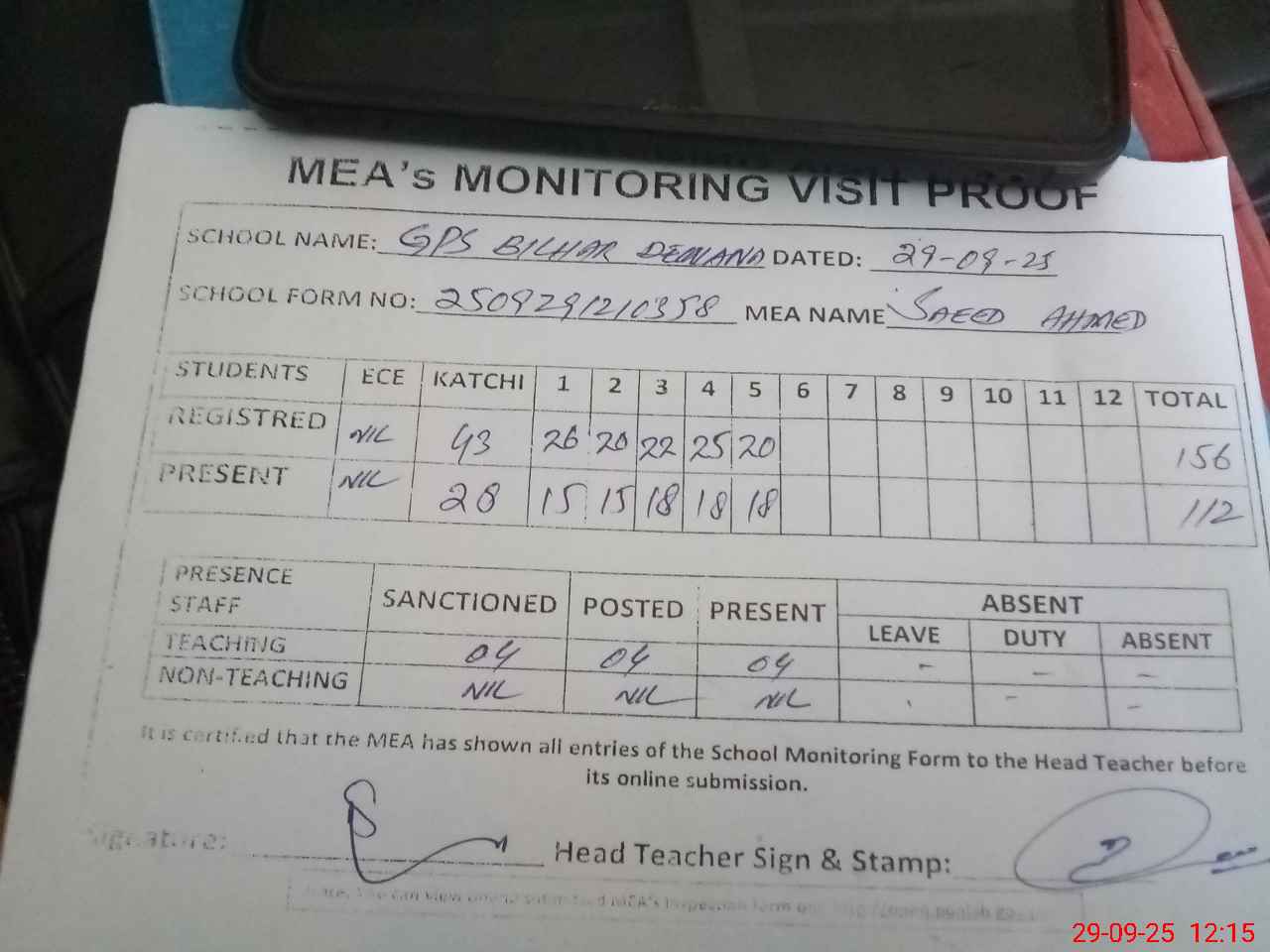 | Attendance Register | Head Teacher | MEA with School | Visit Proof |