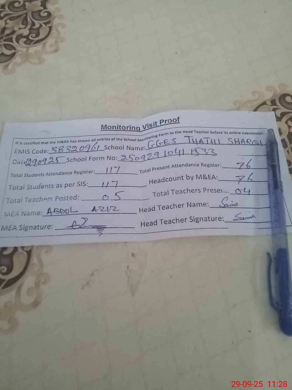 | Attendance Register | Head Teacher | MEA with School | Visit Proof |