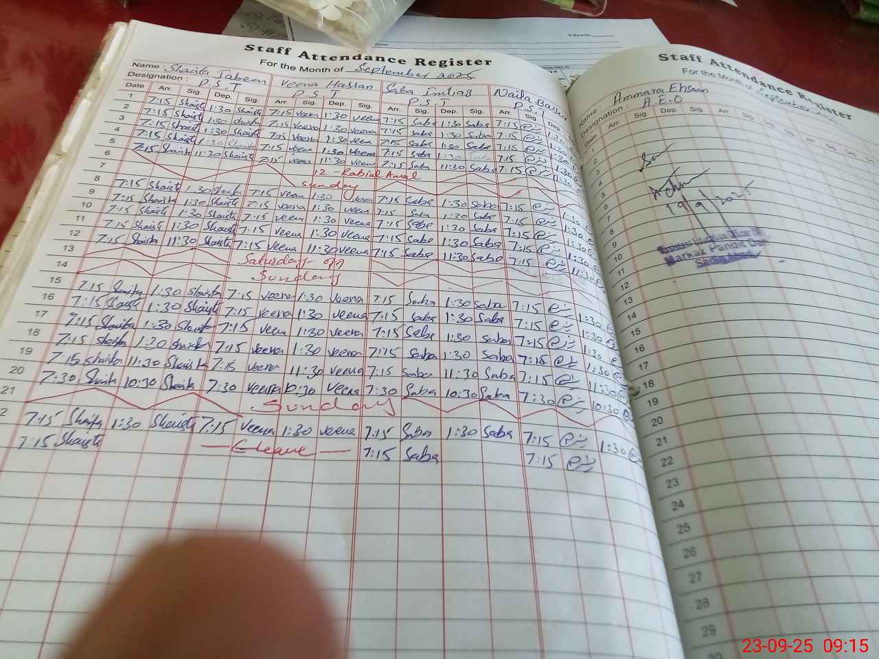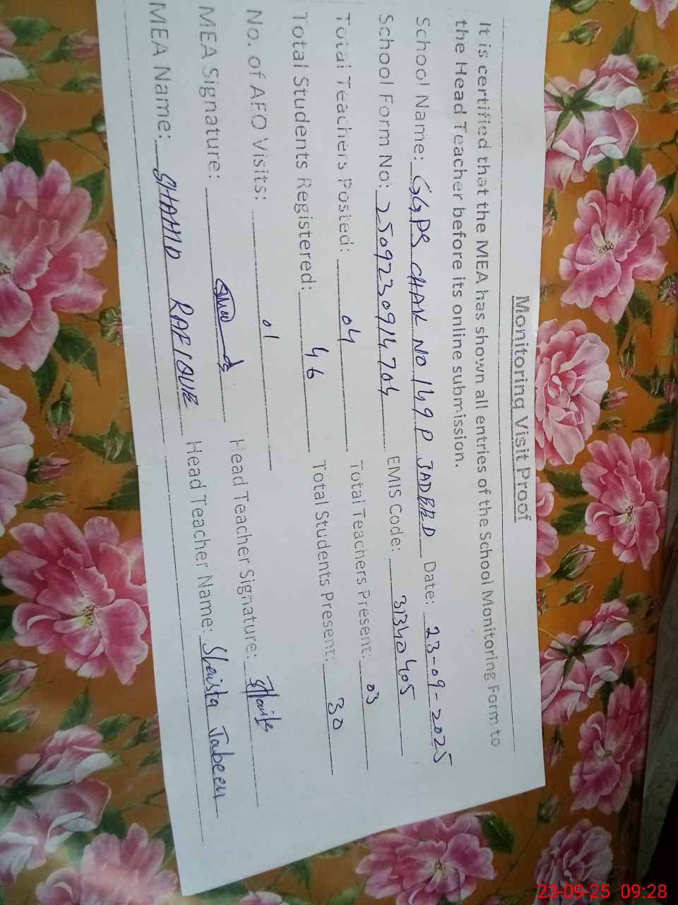 | Attendance Register | Head Teacher | MEA with School | Visit Proof |