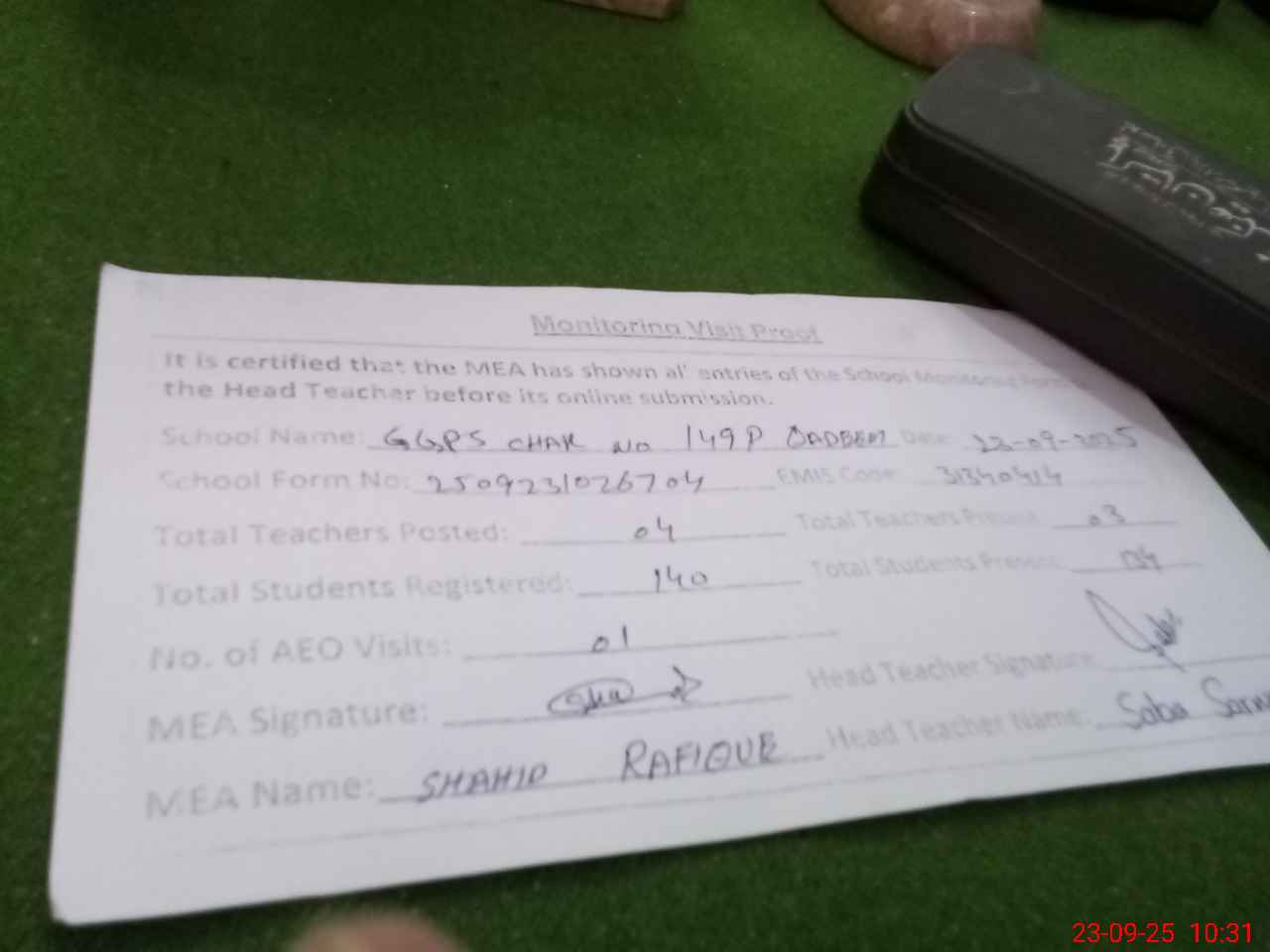 | Attendance Register | Head Teacher | MEA with School | Visit Proof |