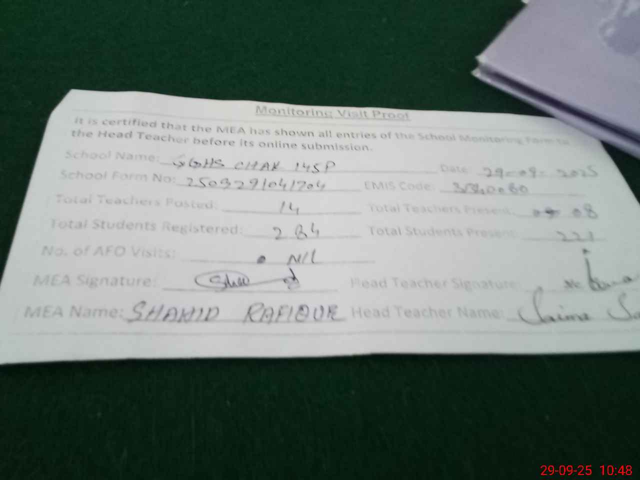 | Attendance Register | Head Teacher | MEA with School | Visit Proof |