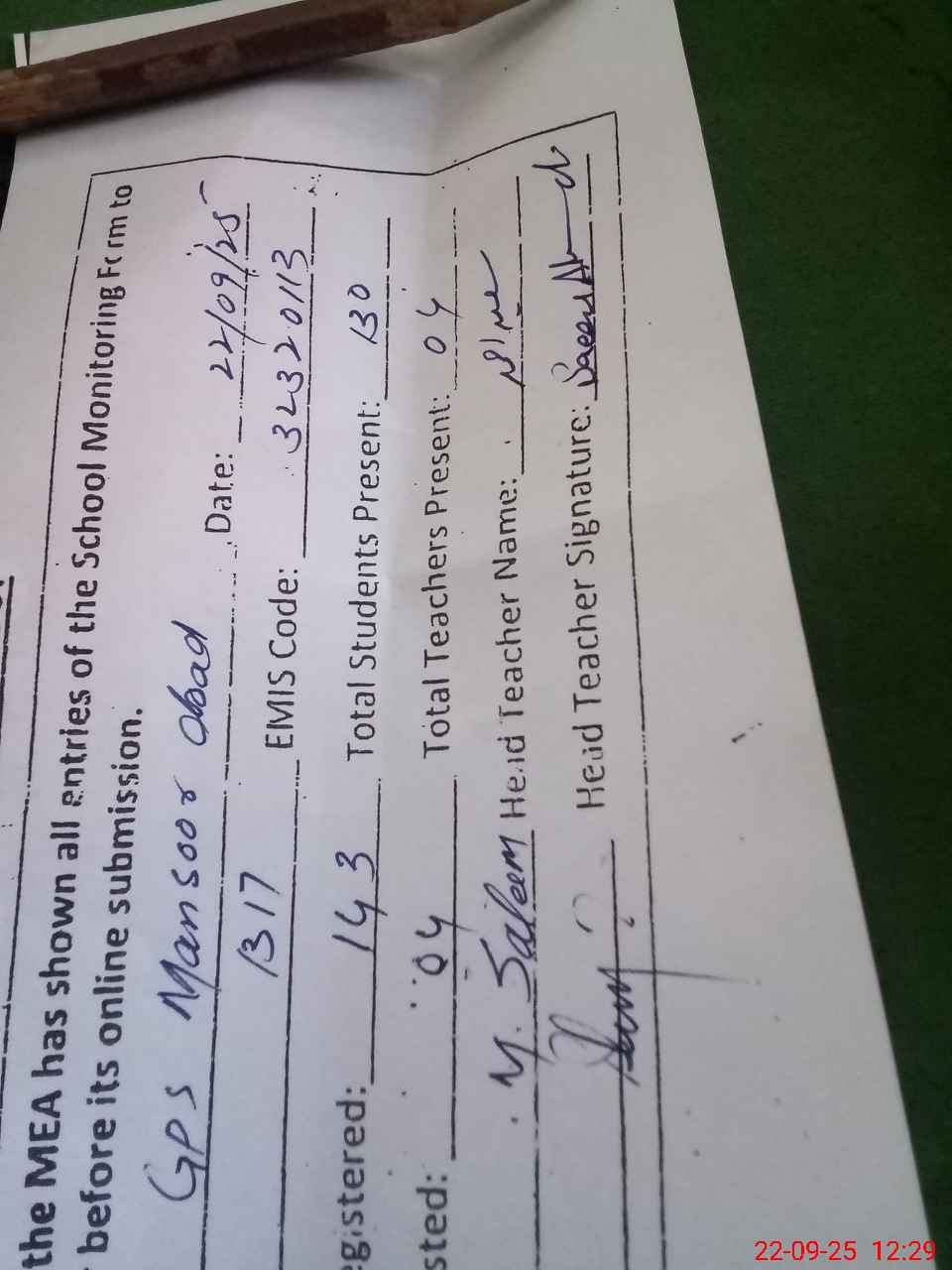 | EMIS Code: 32320113 | Name of School: GPS MANSOOR ABAD | |||