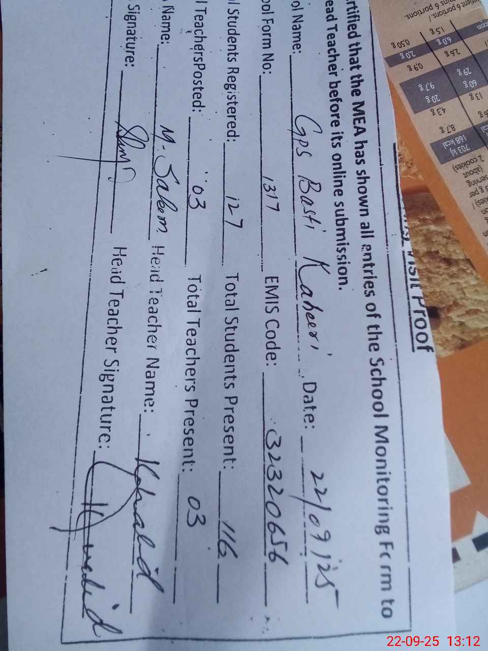| Attendance Register | Head Teacher | MEA with School | Visit Proof |