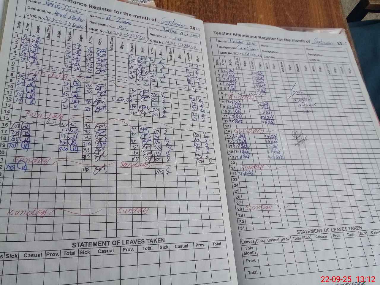 | CNIC | Full Name | Designation | R/C | Absence during last cal. month |