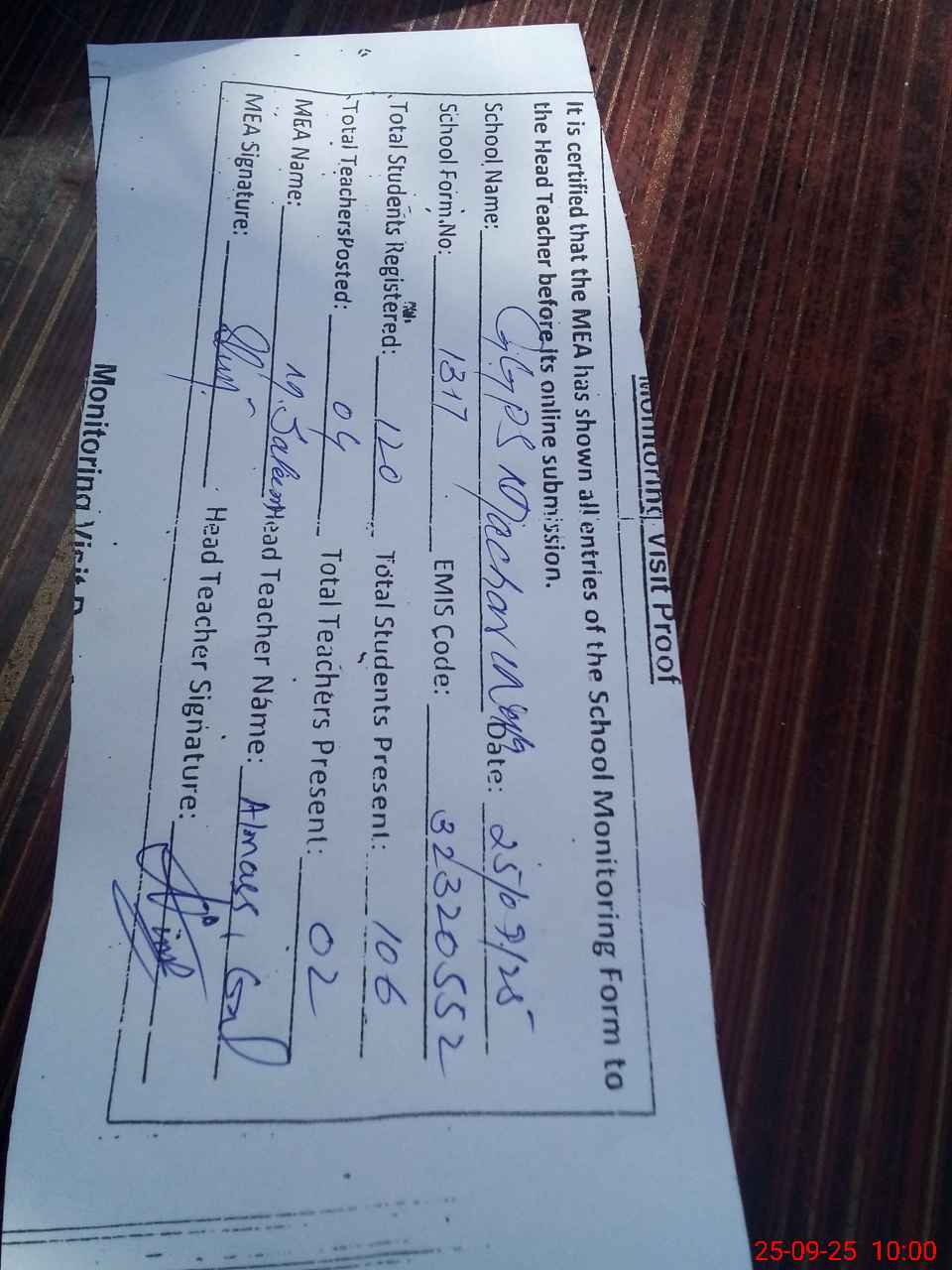 | Attendance Register | Head Teacher | MEA with School | Visit Proof |