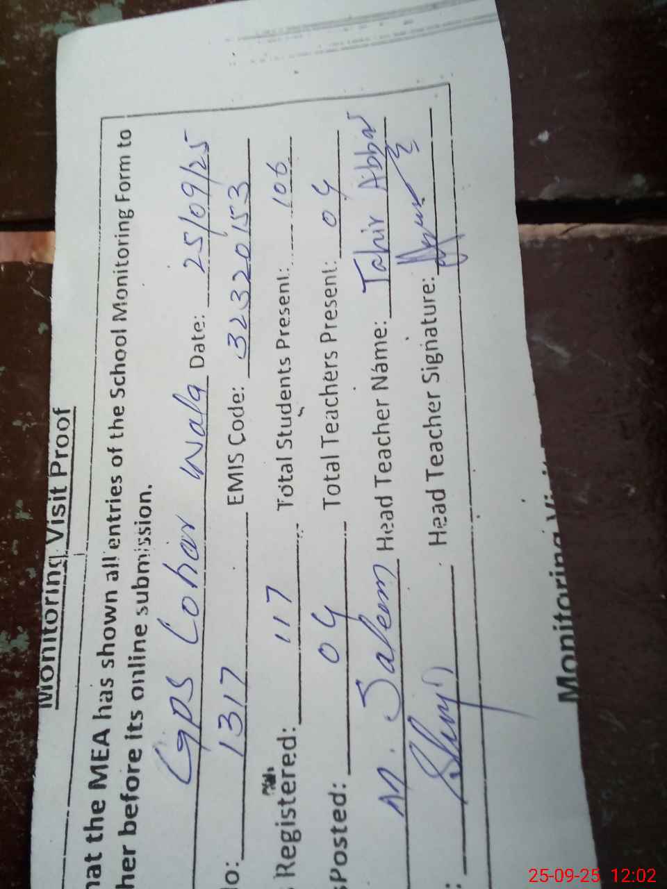 | Attendance Register | Head Teacher | MEA with School | Visit Proof |