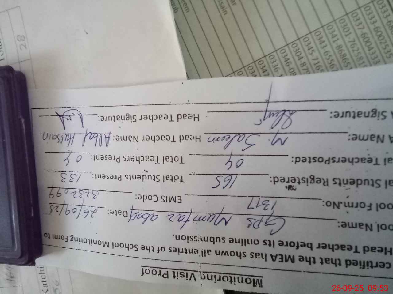 | Certified that this School was Inspected by the Undersigned MEA/DMO Today and the Information Stated Above is as Per Record. | |||||