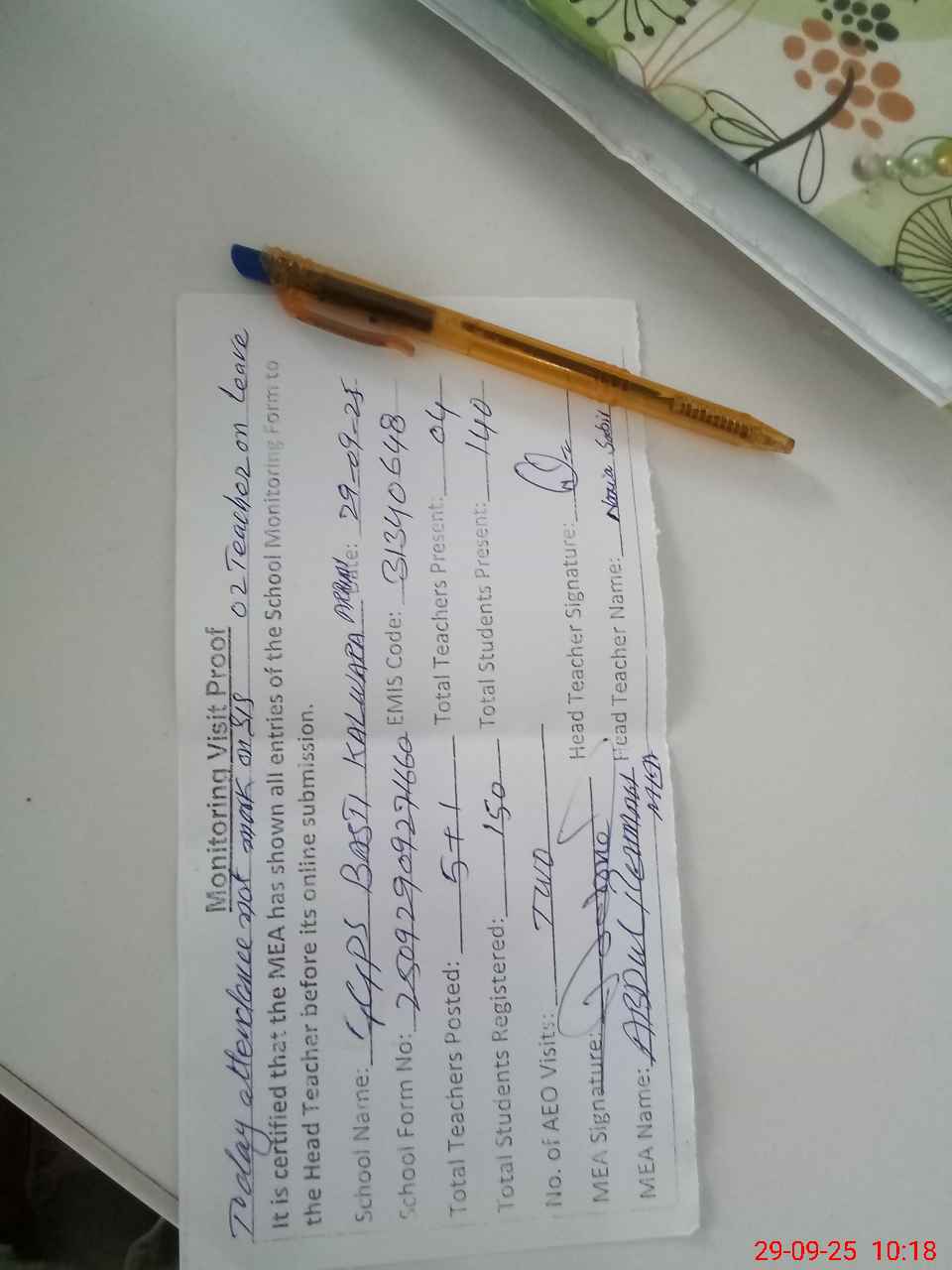 | Attendance Register | Head Teacher | MEA with School | Visit Proof |