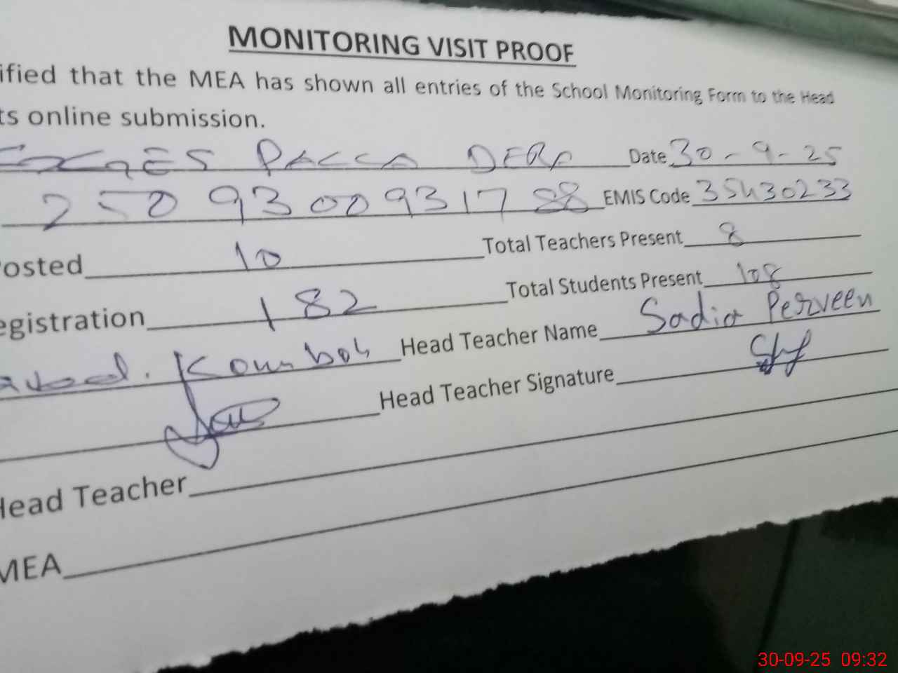 | Attendance Register | Head Teacher | MEA with School | Visit Proof |