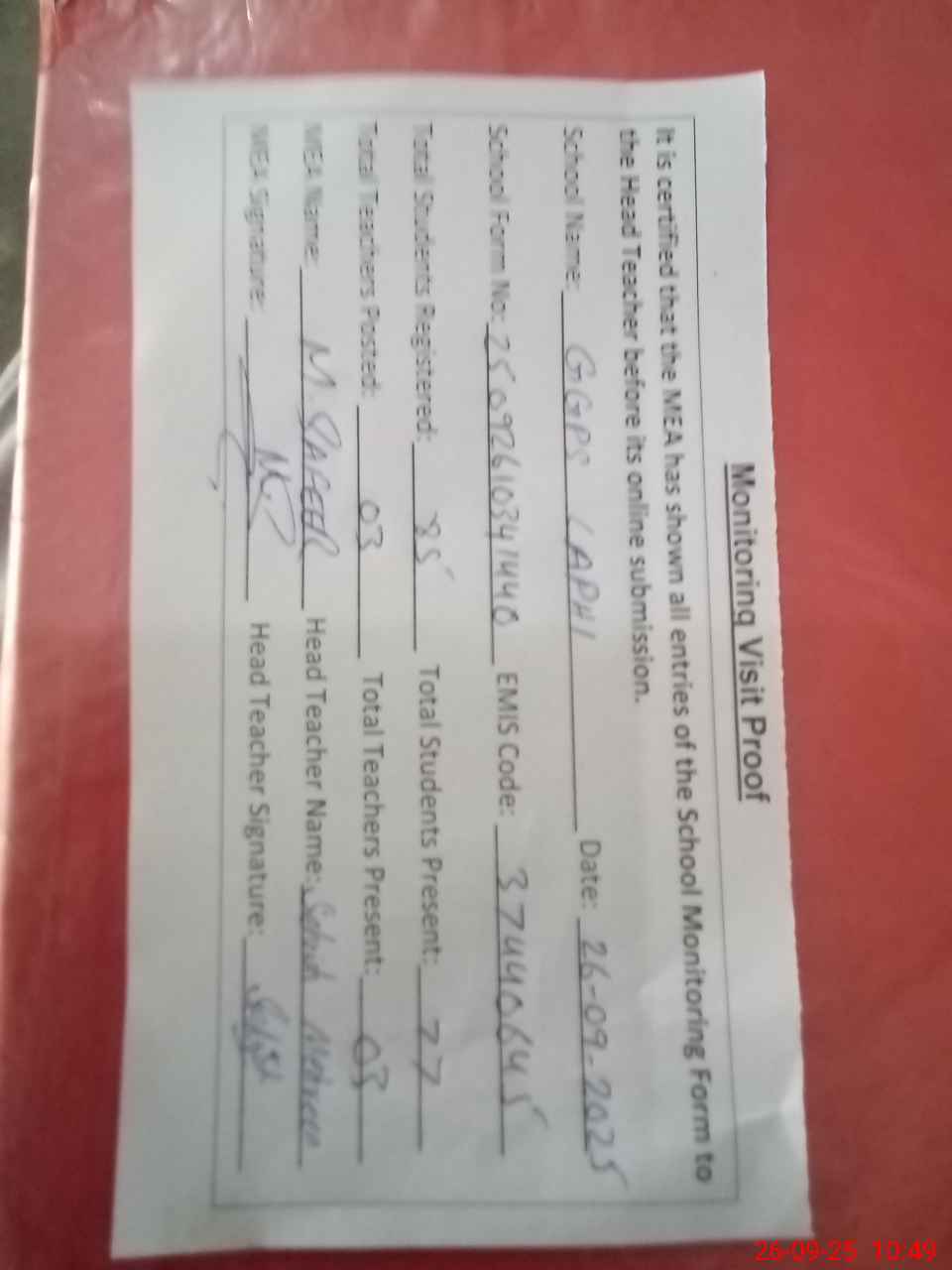 | Attendance Register | Head Teacher | MEA with School | Visit Proof |