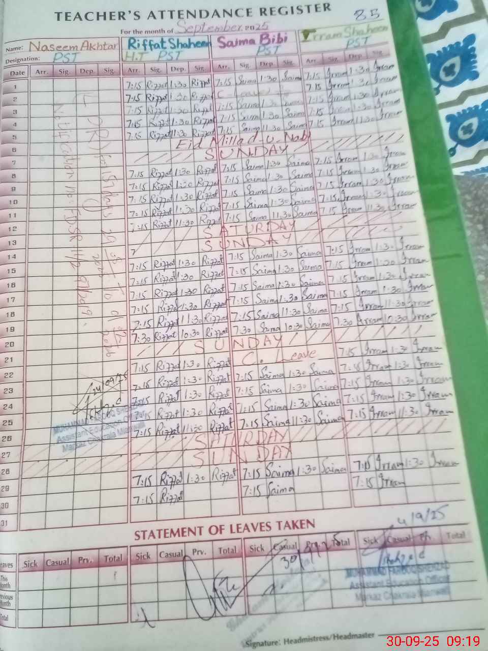 | Name: RI**** SH**** Designation: (School Headmaster's/Headmistress's) PST Phone/Cell Number: 03**** |