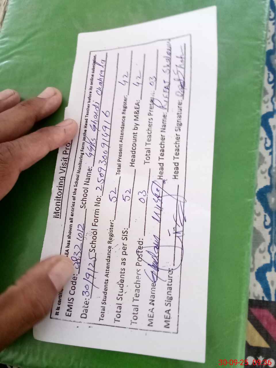 | Attendance Register | Head Teacher | MEA with School | Visit Proof |