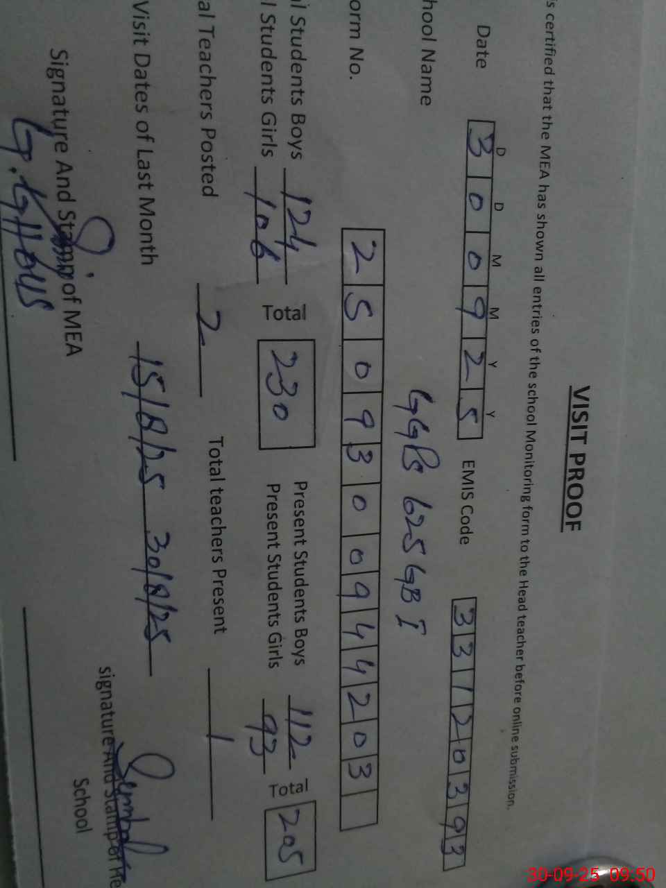 | Attendance Register | Head Teacher | MEA with School | Visit Proof |