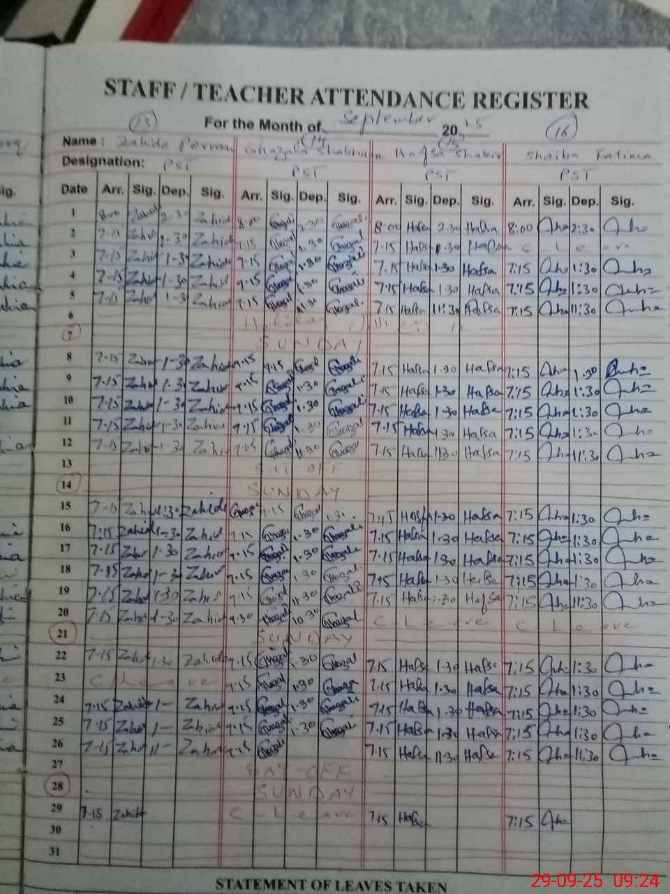 | CNIC | Full Name | Designation | R/C | Absence During Last Calender Month |