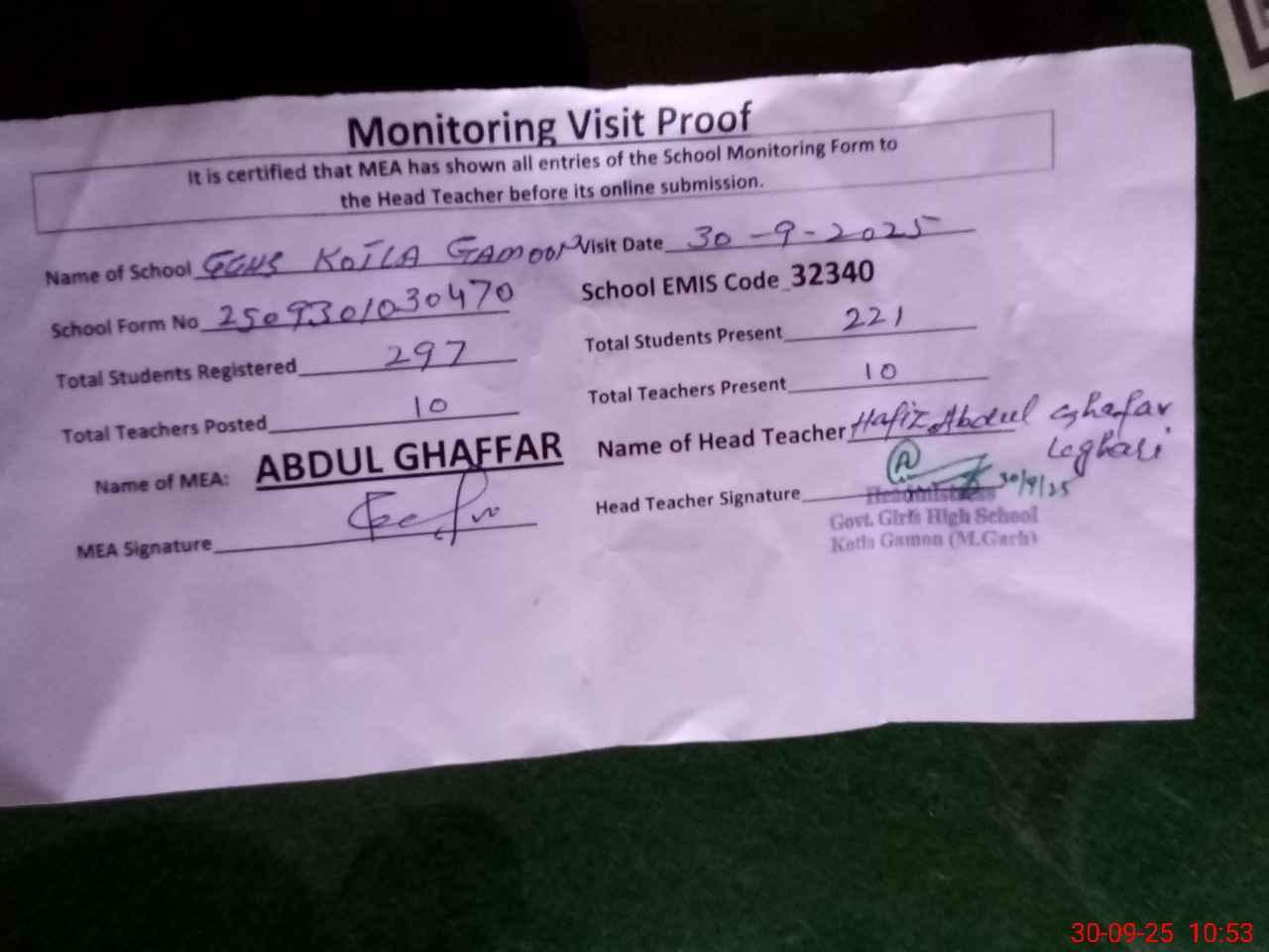 | EMIS Code: 32340300 | Name of School: GGHS KOTLA GAMOON | |||