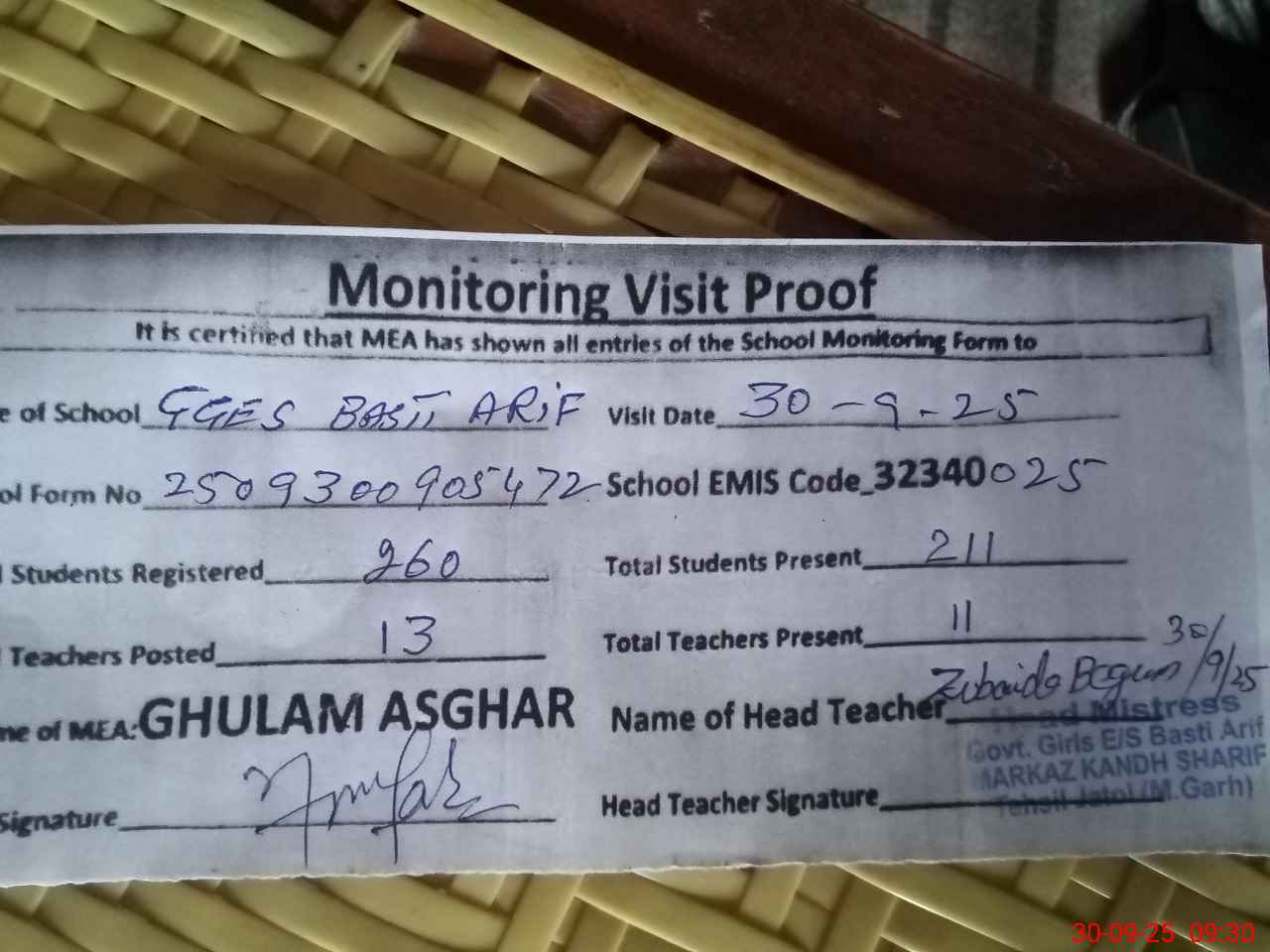 | EMIS Code: 32340025 | Name of School: GGES BASTI ARIF | |||