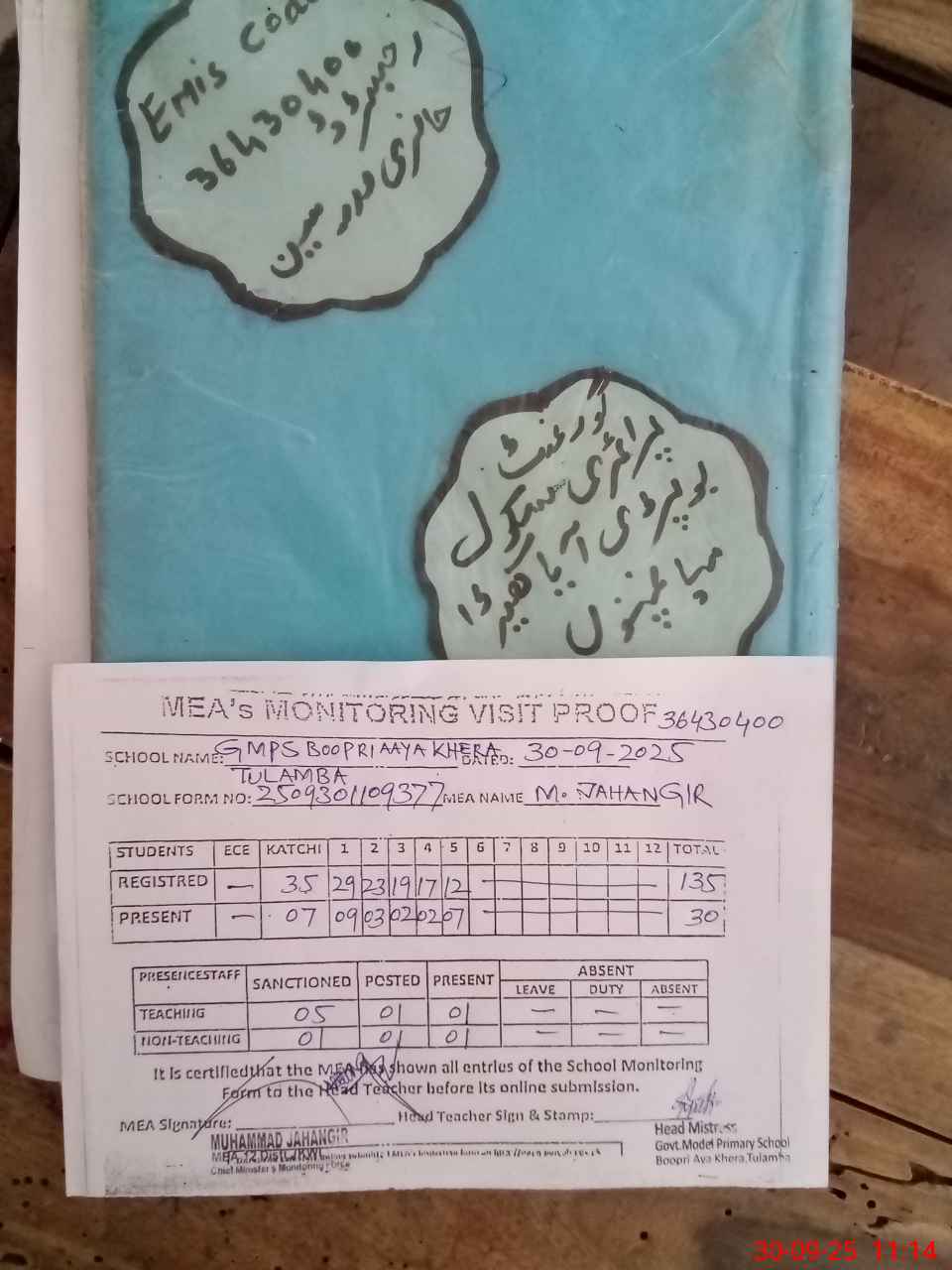 | Attendance Register | Head Teacher | MEA with School | Visit Proof |