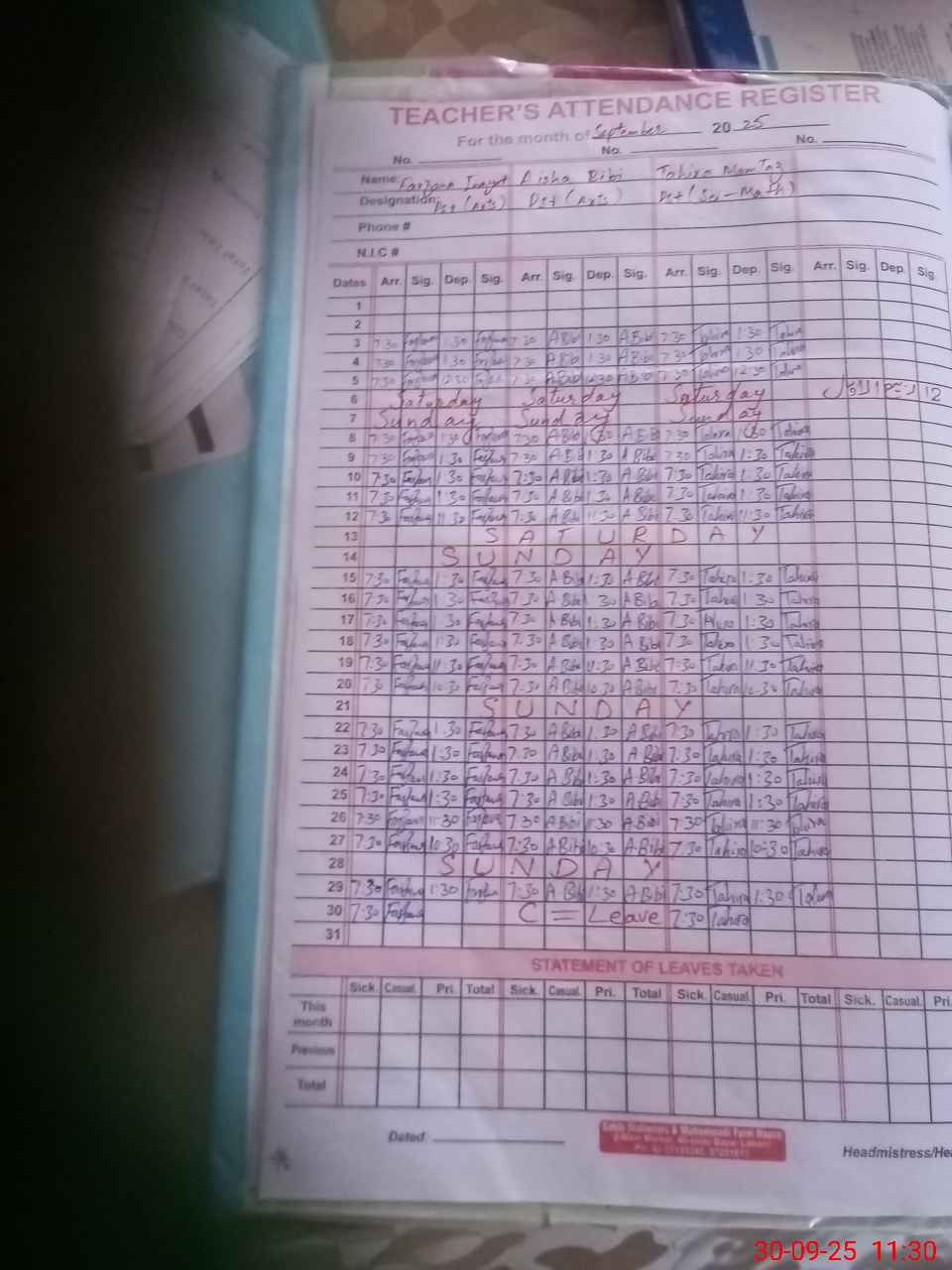 | CNIC | Full Name | Designation | R/C | Absence During Last Calender Month |