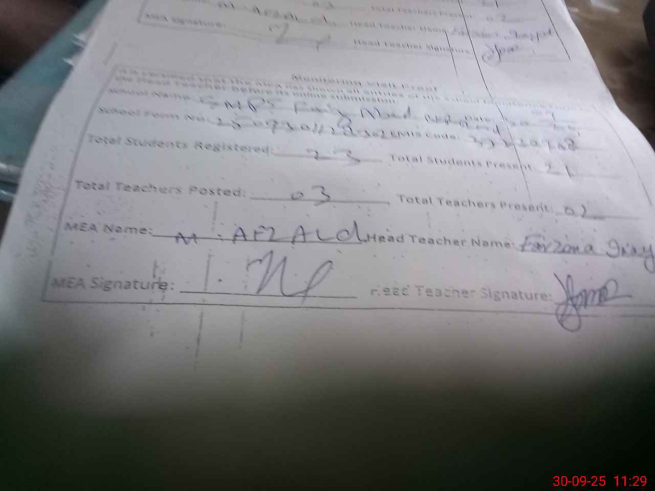 | Attendance Register | Head Teacher | MEA with School | Visit Proof |