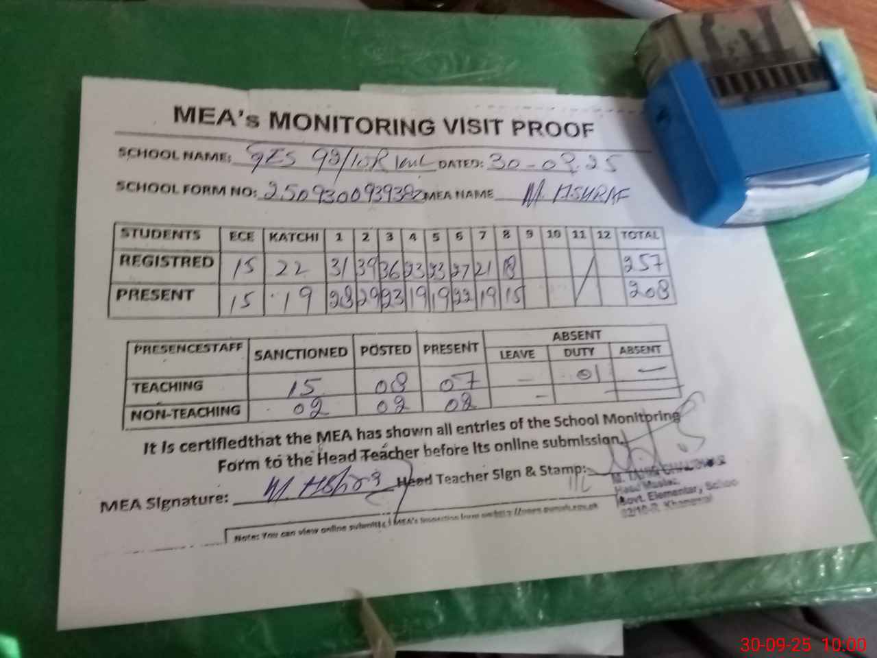 | Attendance Register | Head Teacher | MEA with School | Visit Proof |