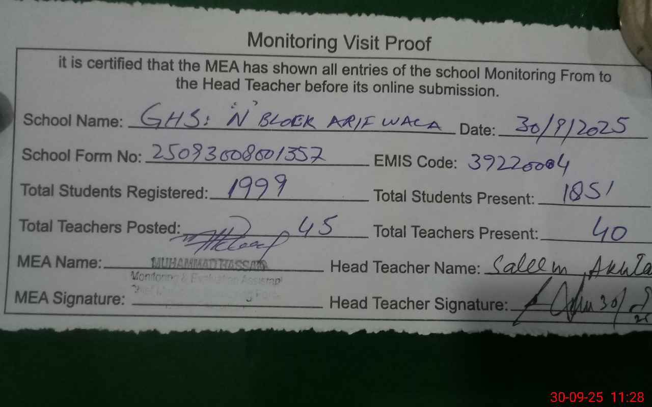 | EMIS Code: 39220004 | Name of School: GHS ARIFWALA N BLOCK | |||