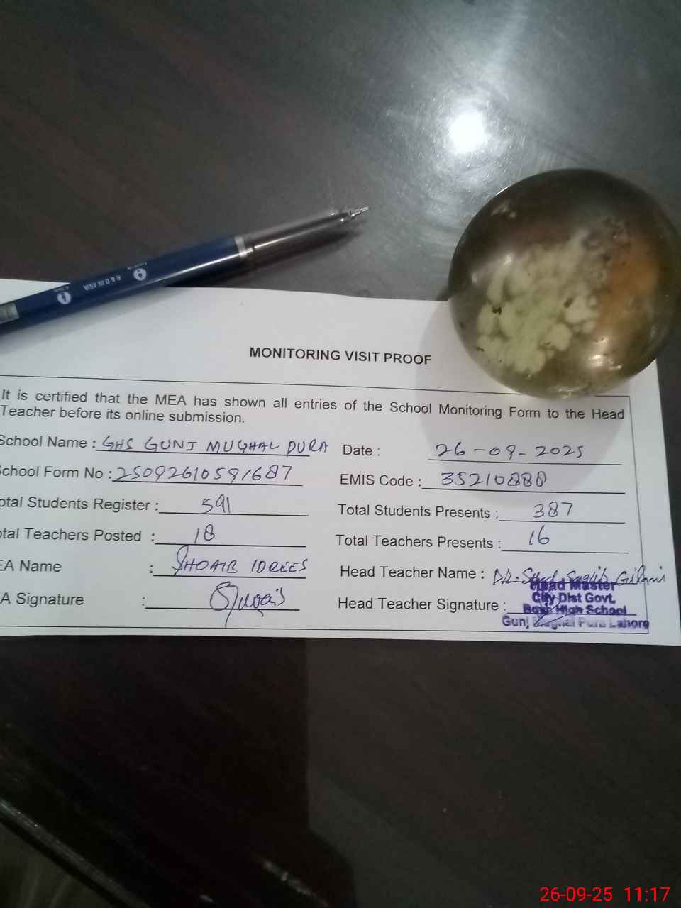 | EMIS Code: 35210888 | Name of School: GHS GUNJ MUGHAL PURA (EX-MCL) | |||