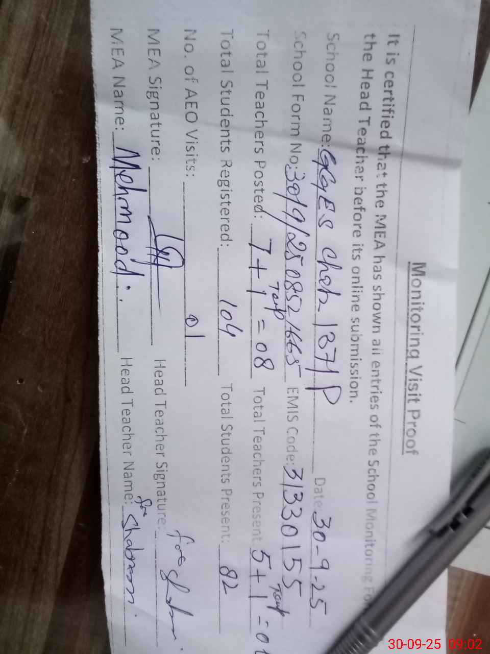 | Attendance Register | Head Teacher | MEA with School | Visit Proof |