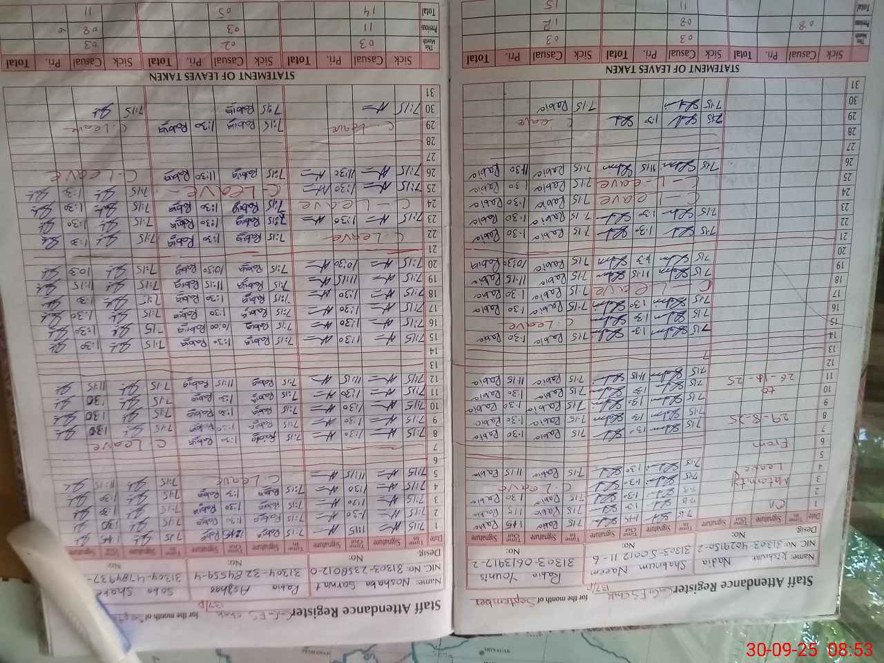 | CNIC | Full Name | Designation | R/C | Absence during last cal. month |