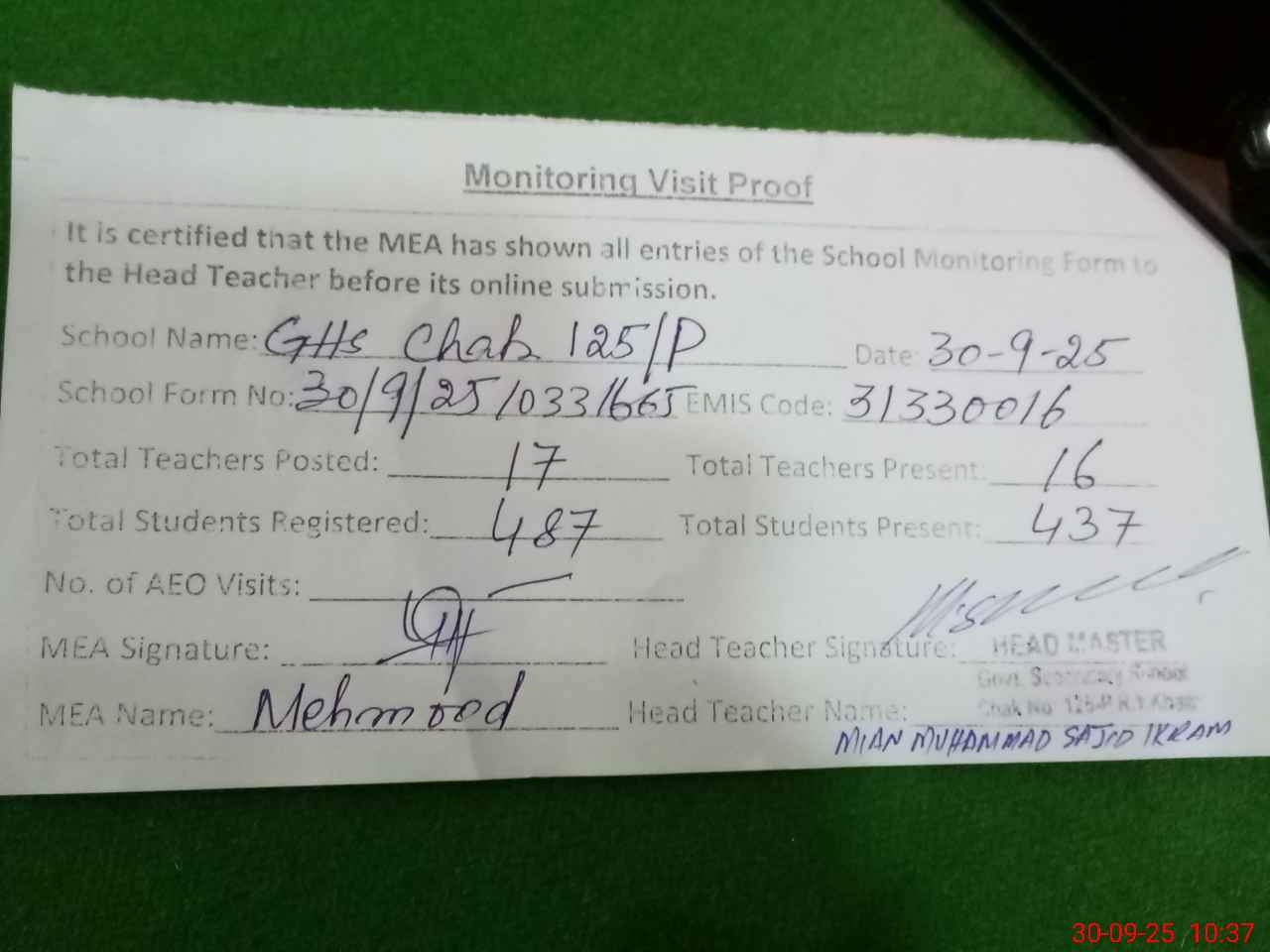 | EMIS Code: 31330016 | Name of School: GHS CHAK NO 125 P | |||