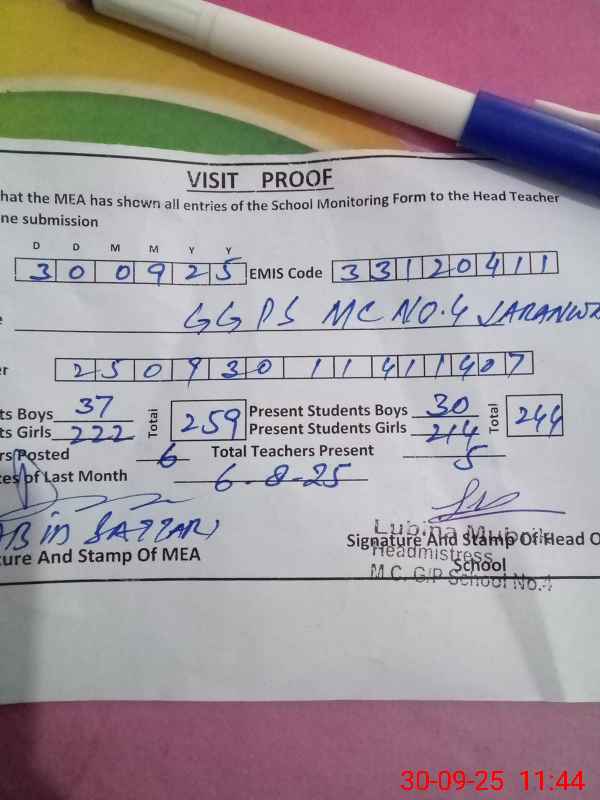 | EMIS Code: 33120411 | Name of School: GGPS MC NO. 4 JARANWALA | |||