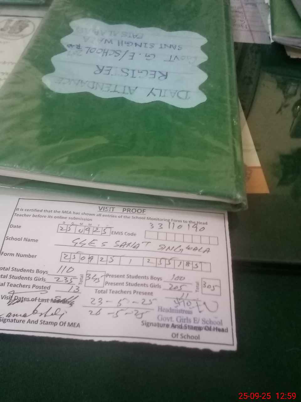 | Attendance Register | Head Teacher | MEA with School | Visit Proof |