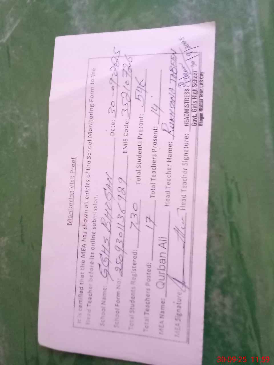 | Certified that this School was Inspected by the Undersigned MEA/DMO Today and the Information Stated Above is as Per Record. | |||||