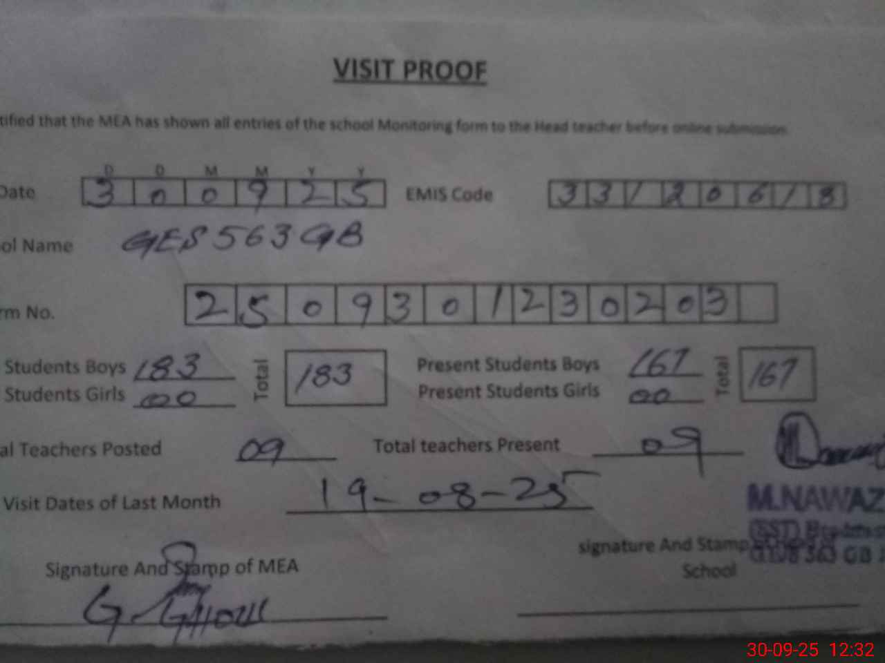 | Attendance Register | Head Teacher | MEA with School | Visit Proof |