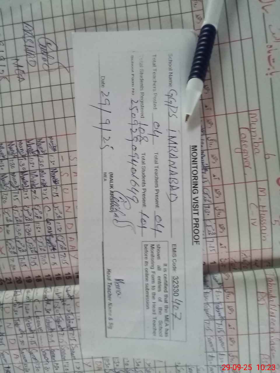 | Attendance Register | Head Teacher | MEA with School | Visit Proof |